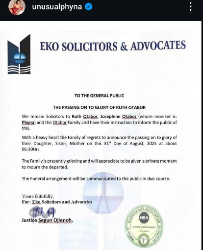 The entertainment industry has been thrown into mourning as tragedy struck the family of BBNaija ex-winner, Phyna. According to reports, her younger sister, Ruth Otabor, passed away on August 31, 2025, following complications from an accident.