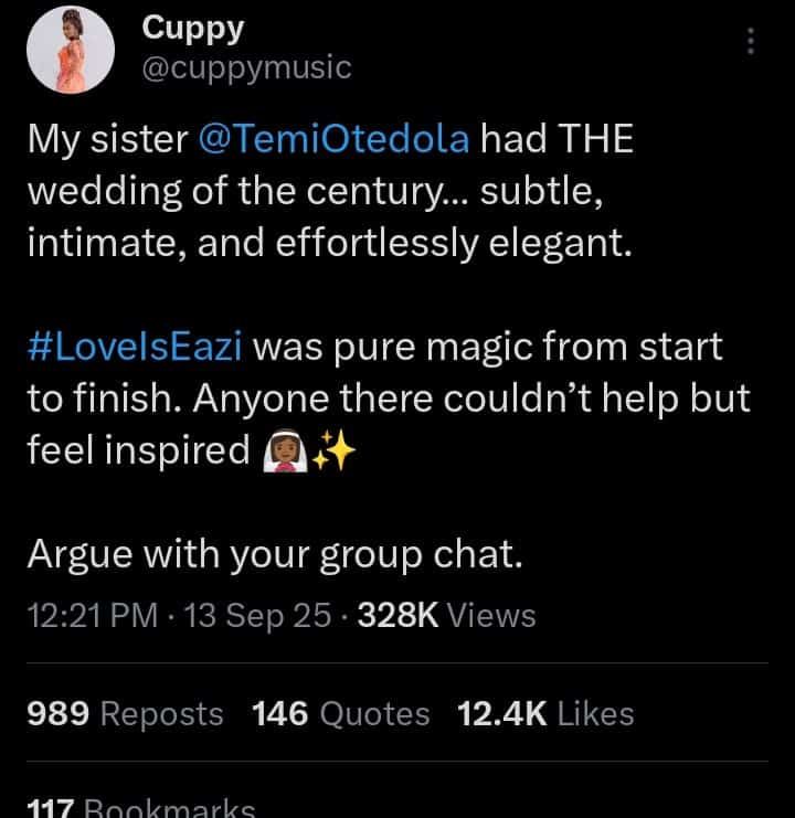 “My sister @TemiOtedola had THE wedding of the century… subtle, intimate, and effortlessly elegant. LoveIsEazi was pure magic from start to finish. Anyone there couldn’t help but feel inspired. Argue with your group chat.”